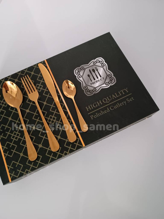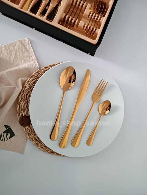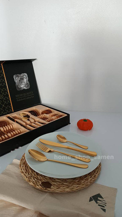 جنس استیل ضدزنگ با روکش طلایی، شیک و بادوام طراحی مدرن، مناسب پذیرایی رسمی و روزمره شامل: 6 عدد چاقو 6 عدد چنگال 6 عدد قاشق غذاخوری 6 عدد قاشق چایخوری بستهبندی شیک و کادویی