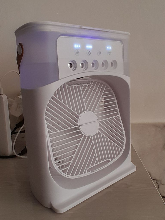 پنکه مه پاش رومیزی مدل Air Cooler Fan فاقد باتری است و به صورت مستقیم توسط آداپتور و کابل USB Type C به برق متصل میشود. دارای پنج نازل مه پاش قوی و قابلیت تنظیم تعداد مه پاش ها است. دارای پد خوشبو کننده و تایمر جهت خاموشی خودکار می باشد. فن دستگاه قابلیت تنظیم دستی و چرخش ۳۶۰ درجه در یک جهت را دارد و محافظ فن دارای قابلیت باز و بسته شدن جهت نظافت پره ها میباشد. ترجیحا از آب تصفیه شده درون دستگاه استفاده شود جهت جلوگیری از رسوب.