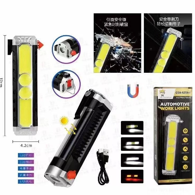 چراغ قوه مدل GSH-9259 دارای 6 حالت نوری میباشد که یکی از انها بصورت چراغ خطر و ابی/قرمز است. این کالا در چندین تنوع نوری میباشد که بصورت عادی و فلش دار عمل میکند. همچنین نوع شارژ این مدل هم بصورت سولار پنل خورشیدی است که در زمانی که برق نیست میشود استفاده کرد از طریق شارژ گرفتن از نور خورشید و هم بصورت کابل شارژ. همچنین یک مگنت اهنربایی در پشت دارد که میتوان برای نصب روی اجسام فلزی بکار برود. این کالا یک چکش فلزی برای شکستن شیشه در مواقع ضرروری و یک تیغ کاتر نیز دارد