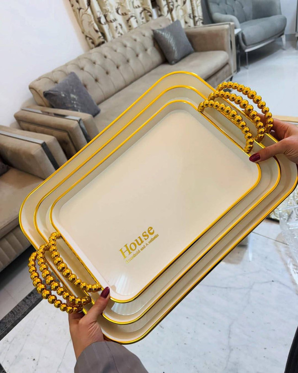موجود در سه طرح و سه سایزبا لبه طلایی رنگ ثابتسینی مستطیلیدر مدل سفید با لبه طلایی ۳ عددی️سایز بزرگ: ۴۲×۳۲ سانت️سایز متوسط: ۳۸×۲۷ سانت️سایز کوچک: ۳۲×۲۲ سانت
